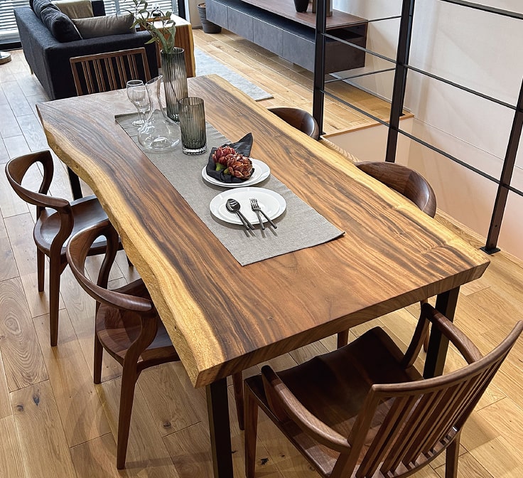 豊富な樹種から、内装材の色・質感・素材と最も相性のいい木材を使って、ダイニングテーブルをオーダーメイドできます。