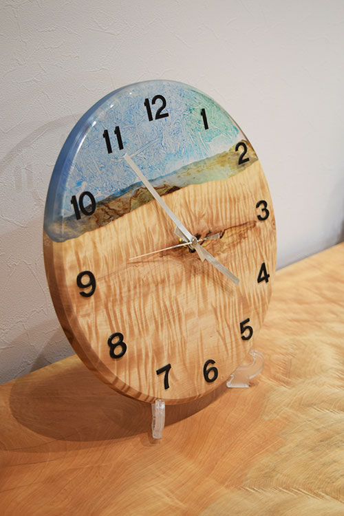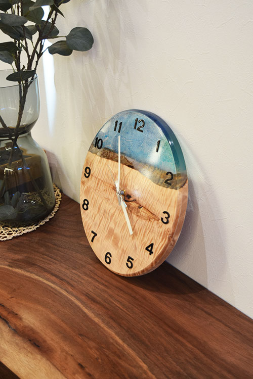 一枚板と涼やかなレジンが美しく調和した一点ものの掛け時計。