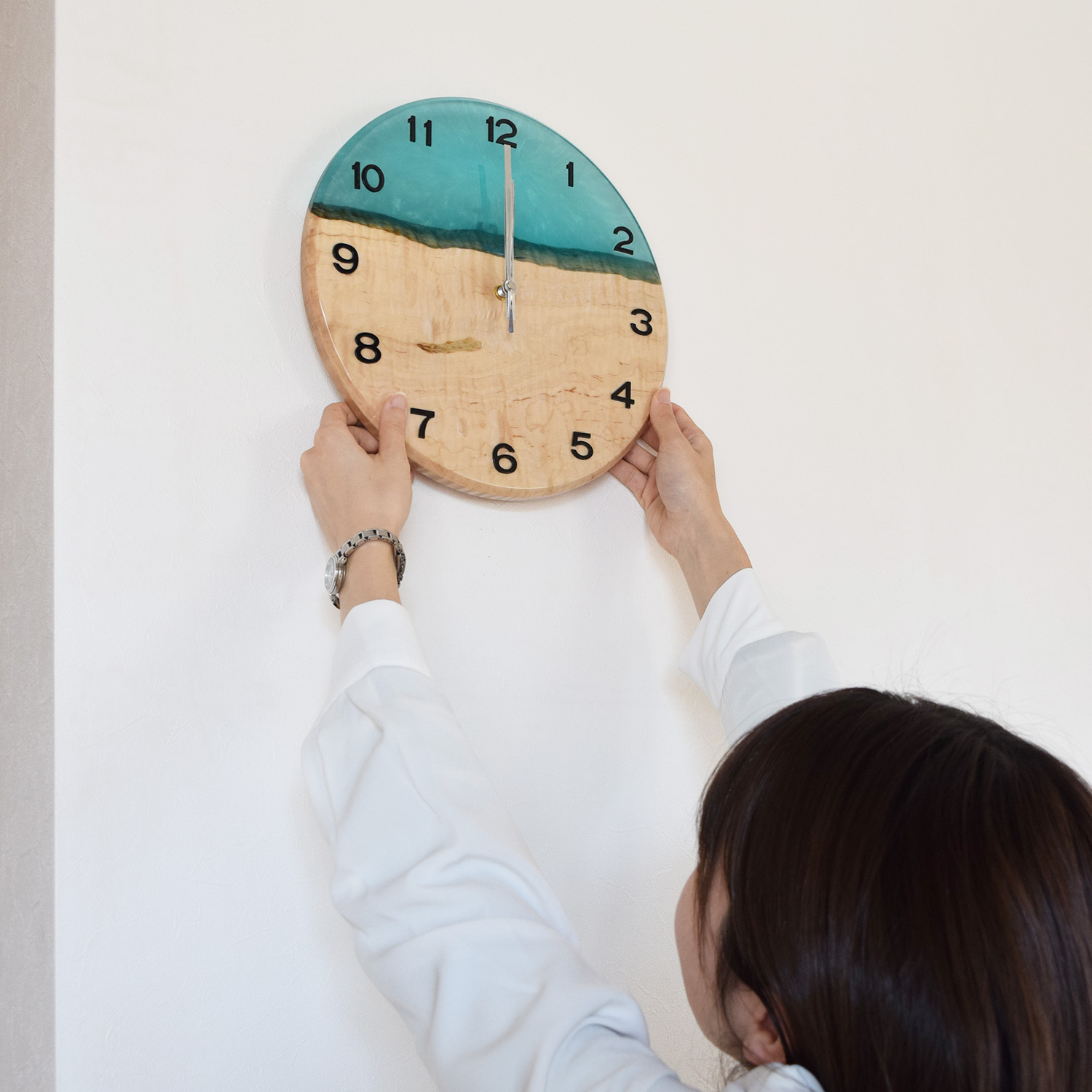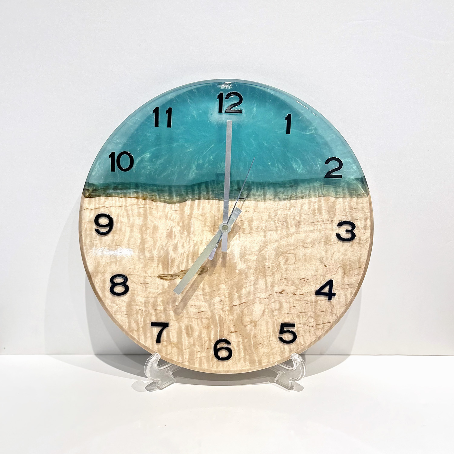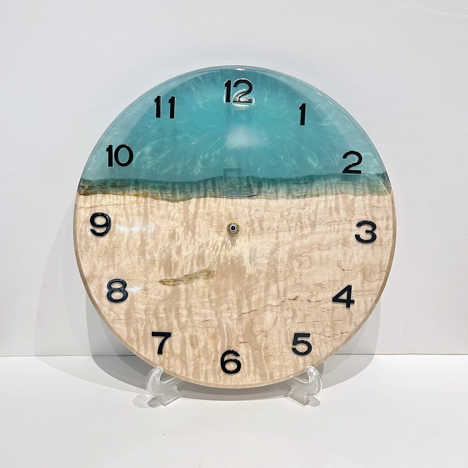一枚板と涼やかなレジンが美しく調和した一点ものの掛け時計。