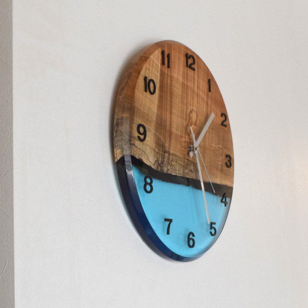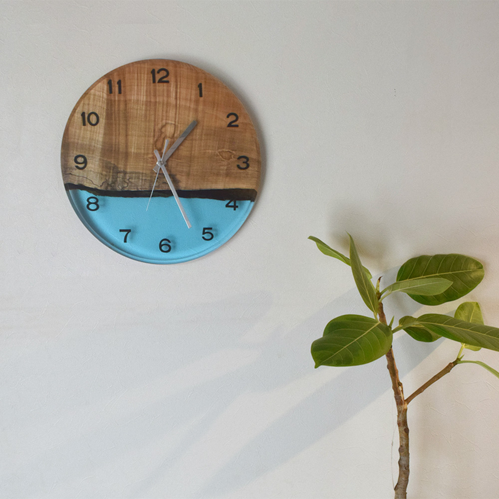 一枚板と涼やかなレジンが美しく調和した一点ものの掛け時計。